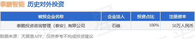 本站消息旭阳配资,根据天眼查APP显示,泰鹏智能(920132.BJ)新增一起对外投资事件,被投资公司为泰鹏投资咨询管理(泰安)有限公司,法定代表人石峰,投资占比为100%。该公司从事商务服务业,注册资本为50万人民币。目前,泰鹏智能共存在对外投资1项,详见下表:
