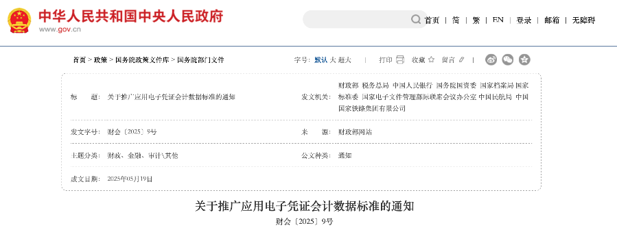 5月19日,财政部、税务总局、中国人民银行、国务院国资委等九部门联合发布《关于推广应用电子凭证会计数据标准的通知》(财会〔2025〕9号)(以下简称《通知》),在全国范围内推广应用电子凭证会计数据标准,推动银行电子回单、银行电子对账单、数电发票、铁路电子客票等多种高频使用电子凭证的全流程无纸化处理。